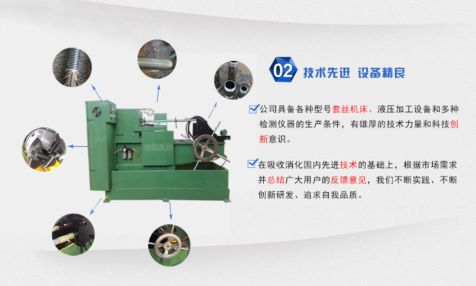 本套丝设备属于无削加工设备,运用特殊的切削技术,上丝轻盈快捷,提高生产效率,采用三点一线,同心度高,性能稳定等优点,本机每分钟可切削3-5根工件,速度快,效率高,对于一些不定长度的钢结构公司,桥梁工程,电力设施等大企业的批量生产之需要。