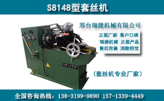 河北省邢台市瑞捷机械设备公司,创建于2003年,坐落在全国的机械制之乡-邢家湾工业区。本厂专业制造套丝机,TS80型套丝机,TS64型套丝机,TS50型套丝机,螺栓套丝机,S8139型套丝机,S8148型套丝机圆钢/圆管套丝机及切线板牙头等配套产品。